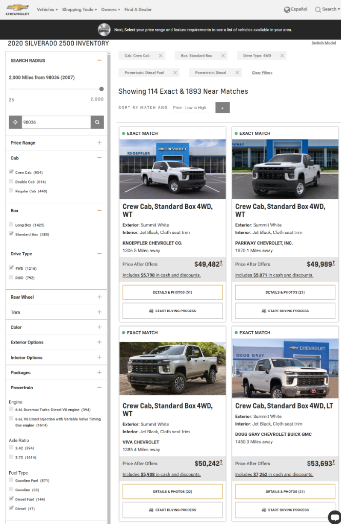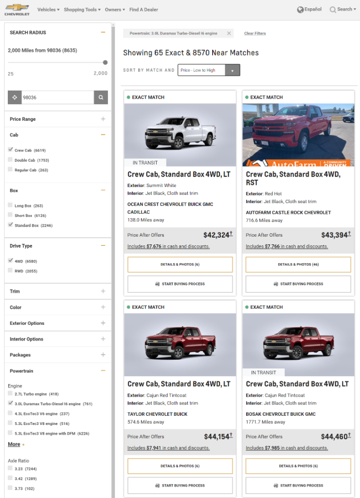 December 1, 20205 yr 53 minutes ago, balthazar said: There are more CC/6.5s in the 2500, but I'm downgrading to a 1500. Would prefer a Sierra, also. GM gives you a 50 mile, 100 mile and 250 mile radius (among others). I don't find going 250 miles out as being logical; would someone drive the truck 250 miles (or more) to NJ, or would they trailer it? Sorry about that, I thought I had clicked the 1500. I was curious and so I called my local Chevy place here and they said that any truck can be brought in from any dealership. If it is greater than 25 miles, they trailer the truck to the dealership. Depending on the association of the dealers it could just be a auto exchange or there could be a basic trailering cost for the company that brings the truck in. They said if I found exactly what I wanted online searching the national database, then a good dealer should be able to get the truck for you or negotiate a like equal truck. I told him the base requirements were CC, Standard bed, 4WD and 3.0L diesel. His response was if it was out there exactly what I wanted he could have it within a week, otherwise it would have to be an order. Very nice guy, I would seriously consider using him down the road. So it looks my friend that if you want, just build it online and see where it is at if it exists the way you want it. Then you have a choice of a delivery fee to have the truck brought in or order. Was an interesting exercise for me, GM seems to be far more flexible or I should say the dealers are being far more flexible in getting a sale than I have seen them in the past. This Pandemic is working in the customers favor I believe.