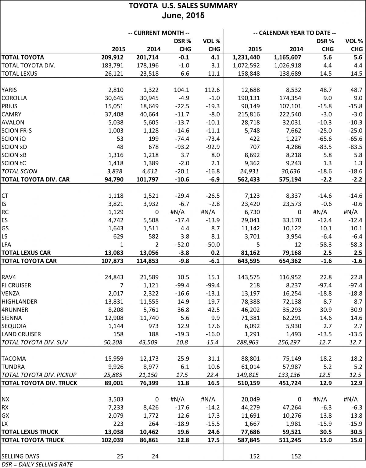 July 1, 201510 yr Toyota Reports Nearly 210,000 Sales in June Toyota Division is No. 1 retail brand in June TMS light trucks set June sales record Lexus posts 11.1 percent increase TORRANCE, Calif. (July 1, 2015) – Toyota Motor Sales (TMS), U.S.A., Inc., today reported June 2015 sales of 209,912 units, an increase of 4.1 percent from June 2014 on a volume basis. With one more selling day in June 2015 than in June 2014, sales were down 0.1 percent on a daily selling rate (DSR) basis. Toyota division posted June 2015 sales of 183,791 units, up 3.1 percent on a volume basis and down 1 percent on a DSR basis. For the first half of the year, TMS reported sales of 1,231,440 units, up 5.6 percent versus the same period in 2014 on a DSR basis. With the same amount of selling days in the first half of 2015 compared to 2014, sales were up 5.6 percent on an unadjusted raw-volume basis. "Light trucks have boosted the industry to its best first half since 2005,” said Bill Fay, Toyota Division group vice president and general manager. "Toyota Division was the number one retail brand in June, led by strong Tacoma, RAV4 and Highlander sales.” Lexus reported June sales of 26,121 units, up 11.1 percent from June 2014 on a volume basis and 6.6 percent on a DSR basis. “The demand for luxury utility vehicles continues to grow and has helped put Lexus and its dealers on a record sales pace for the year,” said Jeff Bracken, Lexus group vice president and general manager. “The new NX compact crossover continues to be one of the hottest new models on the market.” June 2015 Highlights: Camry posted sales of 37,408 units Corolla posted sales of 30,645 units Total Toyota light trucks up 16.5 percent, a June record Highlander up almost 20 percent RAV4 sales rose 15.1 percent to 24,843 units Combined Tacoma and Tundra pickup sales up 22.4 percent Lexus luxury utility vehicles up 24.6 percent All-new NX posted sales of 3,503 units GX up 17.3 percent with sales of 2,079 units