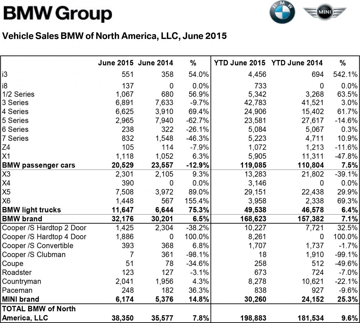 July 1, 201510 yr BMW Group U.S. Reports June 2015 Sales BMW brand up 6.5 percent, sets June record MINI brand sales up 14.8 percent WOODCLIFF LAKE, N.J., July 1, 2015 /PRNewswire/ -- Sales of BMW brand vehicles increased 6.5 percent in June for a total of 32,176 compared to 30,201 vehicles sold in June, 2014. "There's no better follow-up to a record May than a record June with the numbers showing a consistent momentum for BMW as the year reaches the half-way point," said Ludwig Willisch, President and CEO, BMW of North America. "It's clear the U.S. is more in love with light trucks than ever before and the hardest part is supplying the demand. At the same time, I am delighted to see MINI gaining more traction as model availability continues to increase." In June, notable vehicle sales included the BMW 2 Series which increased 56.9 percent to 1,067 vehicles, the BMW 4 Series which increased 69.4 percent to 6,625 vehicles and the BMW X5 which increased 89.0 percent to 7,508 vehicles. BMW Group Sales In total, the BMW Group in the U.S. (BMW and MINI combined) reported June sales of 38,350 vehicles, an increase of 7.8 percent from the 35,577 vehicles sold in the same month a year ago. MINI Brand Sales For June, MINI USA reports 6,174 automobiles sold, an increase of 14.8 percent from the 5,376 sold in the same month a year ago