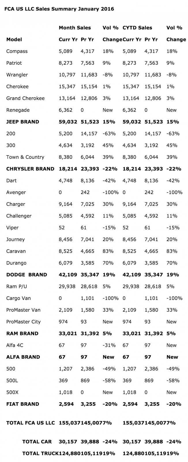 February 2, 201610 yr FCA US LLC Reports January 2016 U.S. Sales Increased 7 Percent; Best January Sales Since 2007 70th-consecutive month of year-over-year sales gains Jeep® brand sales up 15 percent; best January sales ever Jeep Cherokee, Jeep Patriot, and Jeep Compass record their best January sales ever Dodge brand sales up 19 percent; Dodge Challenger, Dodge Charger and Dodge Journey register their best January sales ever Ram pickup truck posts best January sales ever February 2, 2016 , Auburn Hills, Mich. - FCA US LLC today reported U.S. sales of 155,037 units, a 7 percent increase compared with sales in January 2015 (145,007 units), and the group’s best January sales in nine years. The Jeep®, Dodge and Ram Truck brands each posted year-over-year sales gains in January compared with the same month a year ago. The Dodge brand’s 19 percent increase was the largest sales gain of any FCA US brand during the month. The group extended its streak of year-over-year sales gains to 70-consecutive months. “Mother Nature was no match for our Jeep brand last month as we recorded our best January Jeep sales ever,” said Reid Bigland, Head of U.S. Sales. “Overall, FCA US achieved its best January sales in nine years and our 70th-consecutive month of year-over-year sales increases.” Nine FCA US vehicles set records in the month of January, including three Jeep brand vehicles. The Jeep Cherokee, Jeep Patriot, and Jeep Compass; the Dodge Journey crossover, Dodge Challenger, and Dodge Charger; and the Ram pickup truck, Ram ProMaster, and Ram ProMaster City posted their best January sales ever. The Jeep brand continued to set records. Coming off of its best annual sales ever in the U.S. in 2015, the Jeep brand logged its best January sales ever. FCA US finished the month of January with a 103-day supply of inventory (666,652 units). U.S. industry sales figures for January are internally projected at an estimated 17.5 million units Seasonally Adjusted Annual Rate (SAAR). Dodge Brand Dodge brand sales were up 19 percent in January, compared with the same month a year ago. It was the brand’s best January sales in three years. The brand’s 19 percent increase was the largest sales gain of any FCA US brand during the month. The Dodge Challenger, Dodge Charger, and Dodge Journey crossover each posted their best January sales ever. The Dodge Grand Caravan’s 83 percent increase was the largest percentage sales gain of any Dodge brand vehicle in the month and its best January since 2007. The Dodge Durango’s 70 percent increase was its best January sales performance in 10 years. Jeep® Brand The Jeep brand continued its record-setting pace in January. Jeep brand sales increased 15 percent, the brand’s best January sales ever and its 28th-consecutive month of year-over-year sales gains. The Jeep brand has set a sales record in every month dating back to November 2013. The Jeep Cherokee, Jeep Patriot and Jeep Compass each logged their best January sales ever. The Compass’ 18 percent increase was the largest year-over-year percentage gain of any Jeep brand vehicle in the month. The Jeep Grand Cherokee’s 3 percent increase was its best January sales performance since 2004. The brand last month introduced its new premium Jeep Cherokee Overland model at the New England International Auto Show, and announced distinctive, 75th-Anniversary special-edition models available across the entire Jeep lineup. Ram Truck Brand Ram Truck brand sales, which include the Ram pickup, Ram ProMaster, and Ram ProMaster City, were up 5 percent in January, the brand’s best January sales since 2004. Ram pickup truck sales were up 5 percent in January, its best January sales ever. The pickup is coming off of its best annual U.S. sales ever in 2015 and its sixth-straight year of annual sales growth in the U.S. Just last month, Four Wheeler Magazine, a popular off-road enthusiast publication, named the new 2016 Ram 1500 Rebel its “Pickup Truck of the Year.” The Ram ProMaster and ProMaster City vans each logged their best January sales ever. Chrysler Brand Sales of the Chrysler Town & Country minivan were up 39 percent in January, the minivan’s best January sales since 2008. Sales of the Chrysler 300, the brand’s flagship sedan, were up 45 percent for its best January sales performance in three years. Chrysler brand sales were down 22 percent in January, compared with the same month a year ago. The Chrysler brand last month unveiled the all-new 2017 Chrysler Pacifica and Pacifica Hybrid at the 2016 North American International Auto Show in Detroit, reinventing the minivan segment with an unprecedented level of functionality, versatility and technology. The Pacifica will be available in dealer showrooms in spring, with the Pacifica Hybrid arriving in the fourth quarter of 2016. FIAT Brand The all-new 2017 Fiat 124 Spider, the latest addition to the FIAT brand lineup in the U.S., will arrive in FIAT Studios this summer. A favorite at the 2016 North American International Auto Show in Detroit, the 124 Spider revives the storied nameplate, bringing its classic Italian styling and performance to a new generation. Paying homage to the original 124 Spider nearly 50 years after its introduction, the 2017 Fiat 124 Spider delivers the ultimate Italian roadster experience with driving excitement, technology and safety combined with iconic Italian design. FIAT brand sales, which include the Fiat 500, Fiat 500L, and 500X, were down 20 percent in January, compared with the same month a year ago.