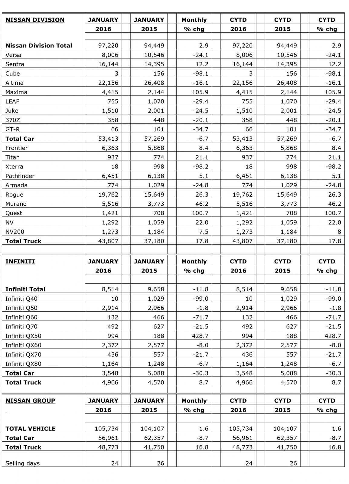 February 2, 201610 yr Nissan Group reports January 2016 U.S. sales NASHVILLE, Tenn. – Nissan Group today announced total U.S. sales for January 2016 of 105,734 units, an increase of 2 percent over the prior year and a January record. Nissan highlights: Nissan Division finished January with 97,220 sales, up 3 percent and also a January record. Overall sales of Nissan crossovers, trucks and SUVs set a January record, up 18 percent. Sales of the Nissan Rogue crossover set a January record at 19,762, an increase of 26 percent. Sales of the Pathfinder SUV set a January record at 6,451, up 5 percent. Sales of the Murano crossover increased 46 percent to 5,516. Sales of the Sentra compact sedan increased 12 percent to 16,144. Nissan Maxima sales climbed to 4,415, up 106%.