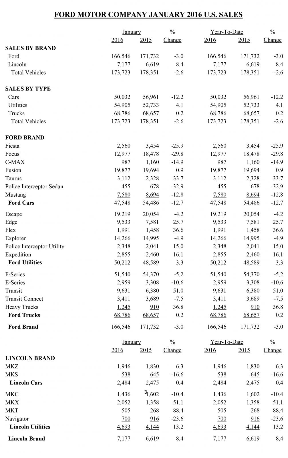February 2, 201610 yr FORD BRAND SUVS POST STRONGEST START SINCE 2004; FORD VANS HAVE BEST START IN 31 YEARS, THANKS TO NEW TRANSIT Ford brand SUVs have their best start since 2004 with 50,212 vehicles sold; Edge sales up 26 percent Transit sales increase 51 percent, driving Ford van sales to their best January since 1985 Lincoln posts January sales up 8 percent on strong demand for all-new Lincoln MKX Ford Motor Company average transaction prices grow almost three times the rate of overall industry; U.S. sales of 173,723 vehicles decline 3 percent versus last year DEARBORN, Mich., Feb. 2, 2016 – Coming off strong results last January, Ford Motor Company’s total U.S. sales of 173,723 vehicles declined 3 percent last month versus a year ago. Bright spots for January include industry-leading transaction price increases for the month, the best start since 2004 for Ford brand SUV sales and an 8-percent gain in sales for Lincoln. “For Ford, overall transaction prices were up $1,800 in January – almost three times more than the overall industry average – driven largely by strong customer demand, especially for our SUVs and F-Series pickups,” said Mark LaNeve, Ford vice president, U.S. Marketing, Sales and Service. Ford SUVs totaled 50,212 sales last month – a 3 percent increase versus a year ago and the brand’s best sales start since 2004. The all-new Edge was the biggest driver, posting a 26 percent jump on sales of 9,533 vehicles. Transit sales increased 51 percent in January with 9,631 vehicles sold, lifting overall Ford van performance 20 percent for their best start since 1985. F-Series January sales totaled 51,540 vehicles, down 5 percent. F-Series average transaction pricing grew $2,500 last month, while incentive spending was down $500 versus a year ago. “We continue seeing strong commercial fleet orders for F-150 and will be filling more orders this year,” LaNeve said. “As the largest seller of commercial vehicles, this represents good news for Ford trucks and the overall economy.” Lincoln sales increased 8 percent, for the best start of the year since 2008. Lincoln sold 7,177 vehicles, and the all-new MKX posted a 51 percent increase with 2,052 vehicles sold. It was Lincoln’s best January for SUVs since 2001.