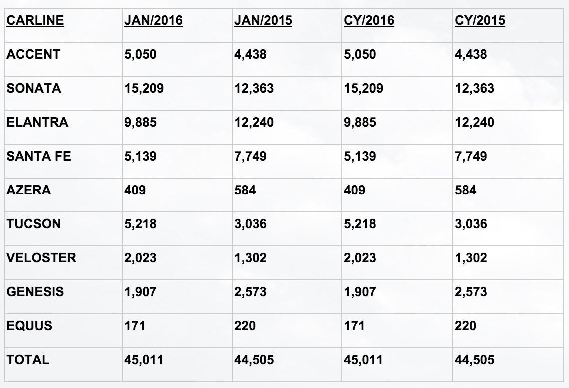 February 2, 201610 yr Hyundai Motor America Reports Its Best January Ever FOUNTAIN VALLEY, Calif., Feb. 2, 2016 /PRNewswire/ -- Hyundai Motor America today reported its best January in company history, selling 45,011 units for the month, up one percent versus the same period last year. "We were able to capitalize on demand in the crossover segment with Tucson sales soaring 72 percent for the month," said Derrick Hatami, vice president of national sales for Hyundai Motor America. "We're poised to grab more of this segment as we introduce our refreshed Santa Fe and Santa Fe Sport models next week at the Chicago Auto Show. Additionally, the all-new 2017 Elantra has begun hitting showrooms and based on the positive media response at our launch last week, we expect to see great things from Elantra in 2016." Other standouts include Veloster with sales up 55 percent; Sonata up 23 percent (both, best January ever); and Accent, up 14 percent for the month.