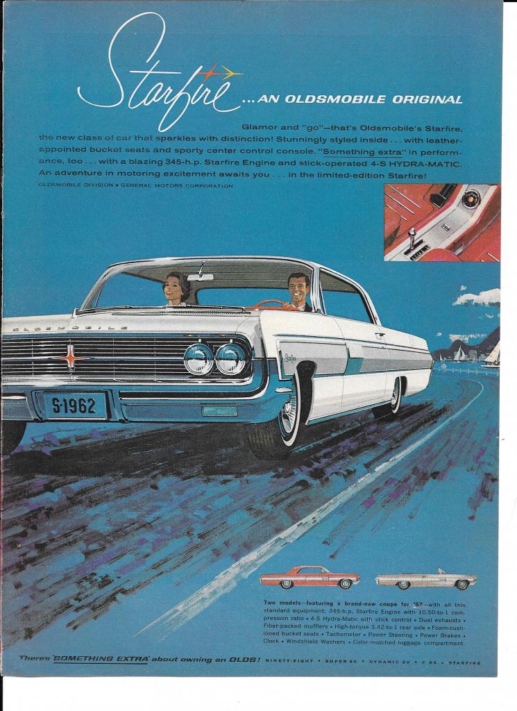 May 5, 20178 yr One of the handful of Olds' I'd strongly consider owning is the second-year '62 Starfire hardtop, and I do like this 'cut-off' ad, that's pretty unusual in car advertising: Also always liked this ad from '50- a ripping car and huge towering '88' numbers: