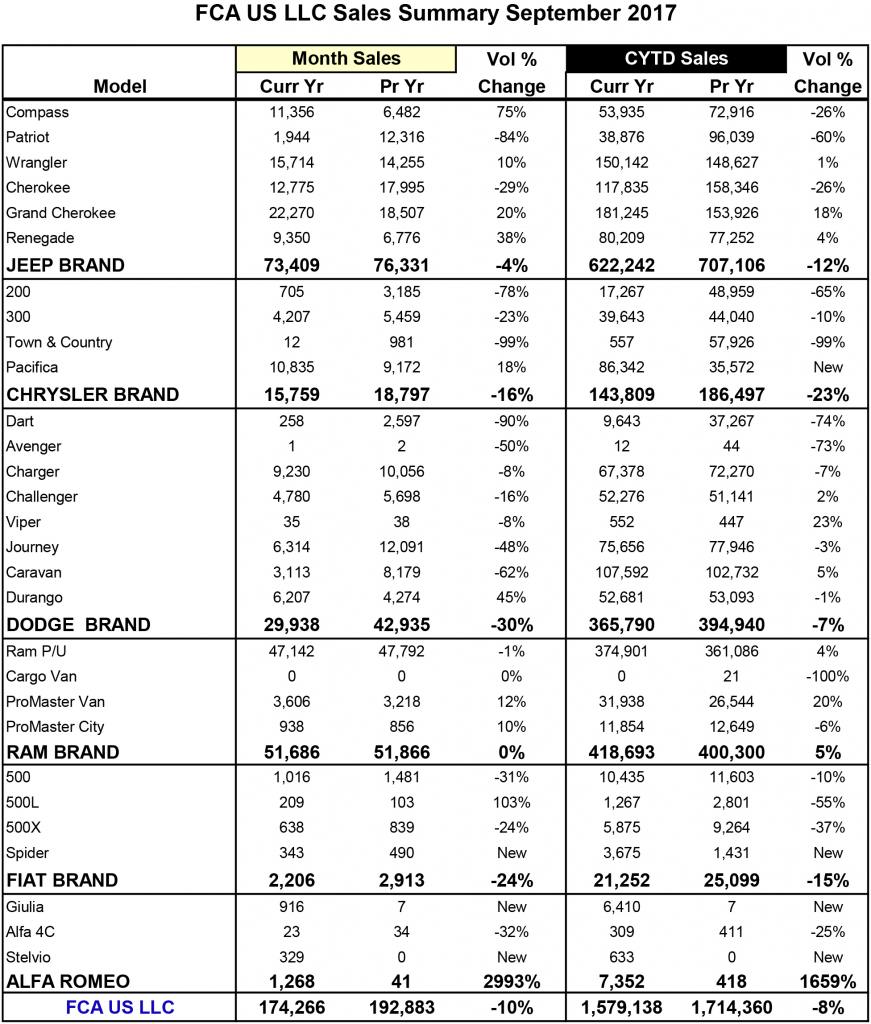 October 3, 2017 , Auburn Hills, Mich. - FCA US LLC today reported sales of 174,266 units, a 10 percent decrease compared with sales in September 2016 (192,883 units).