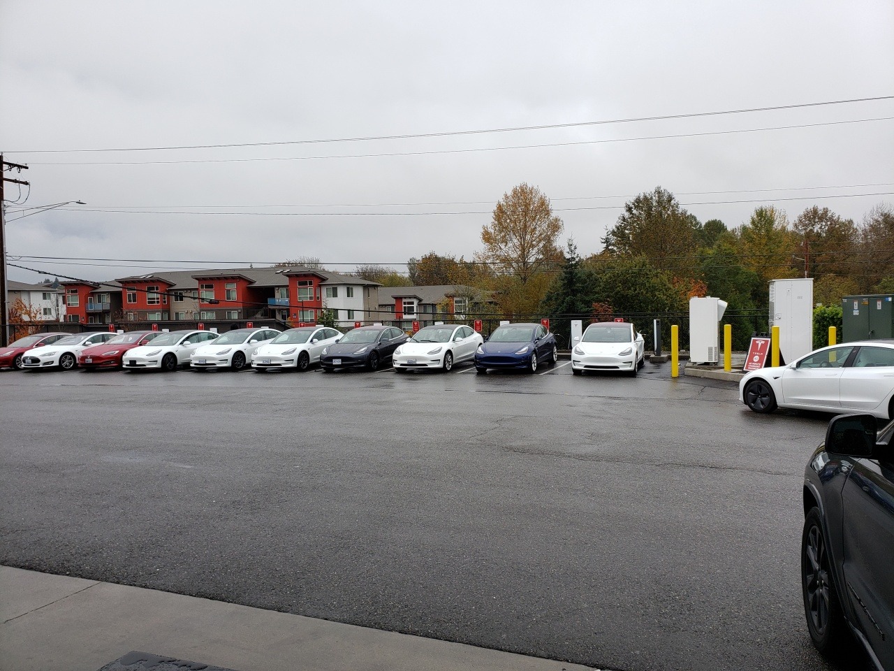 October 20, 20196 yr 3 deep waiting, seems to be backlogged at this Fred Meyers Tesla Charging station. This is pretty common here be it Tesla or the generic charging stations. You have a major shop point, variety of food places and other retail. Makes it easy to charge, shop, eat and go. FYI: Behind these Tesla's are a huge 5000 Apartment complex and many are Tesla Owners, so I am sure this is a major recharge point for them.