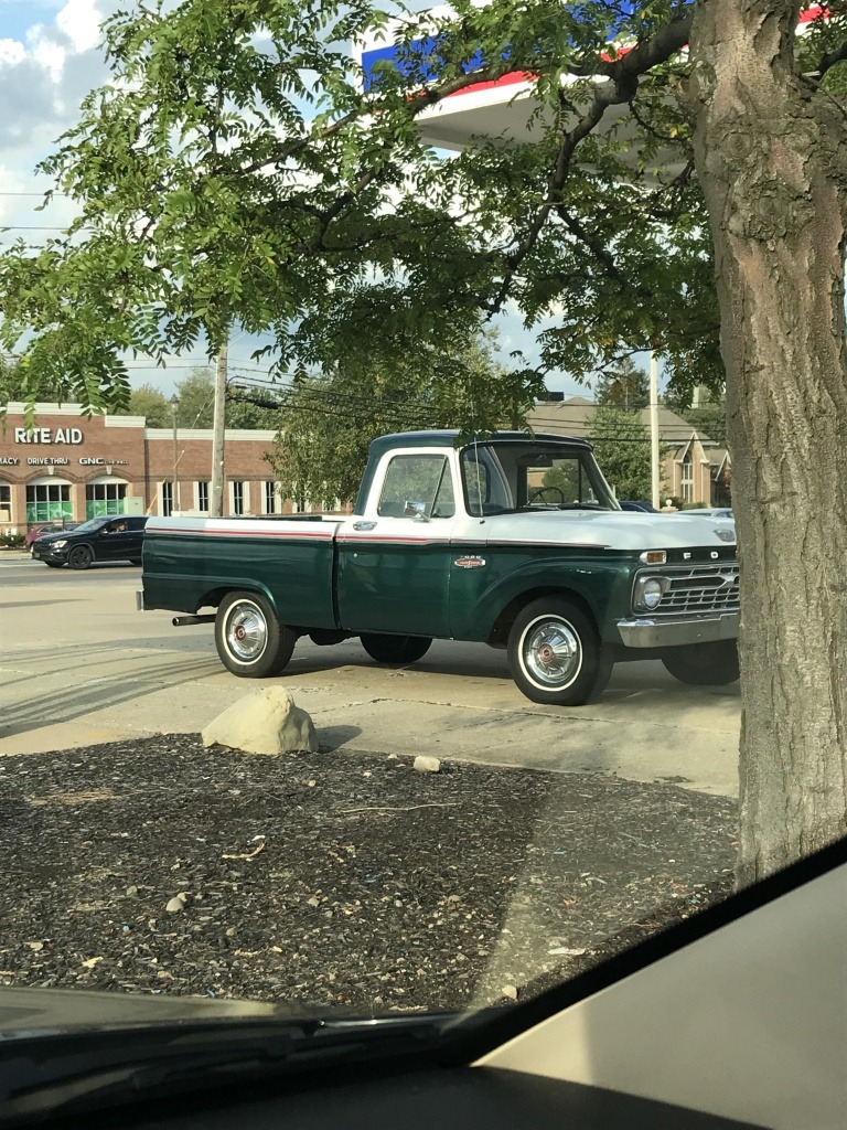 October 1, 20196 yr While sitting at a light I saw this clean '66 Ford F100 at a gas station..just out of the picture to the left behind a bus stop was a turquoise '66 Mustang convertible and a primered 1950-ish Chevy panel truck. Also saw a clean white w/ white interior '74 Pontiac Grand Ville convertible in traffic, rolling top down on this unseasonable 90 degree afternoon...