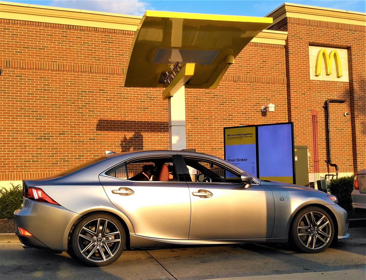 Decent enough burgundy inside, in leather.  It was a Lexus IS 350 AWD, once I got behind it in the drive through. The sun was obviously setting.  I made a noise to the dog.  I thought it was a lab.  When it turned toward me, it had a white patch below the collar.  Not a pure lab.  Dogs are like little kids.  They get rambunctious when riding around in the car.