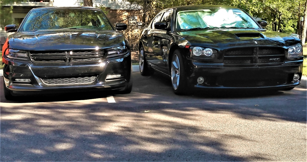 These two like to park next to each other ... two generations of Dodge Charger, in black.