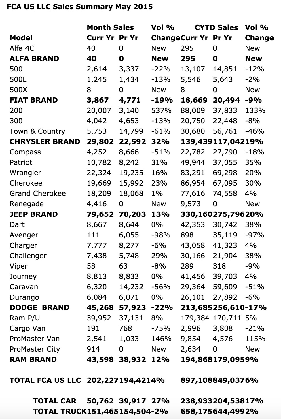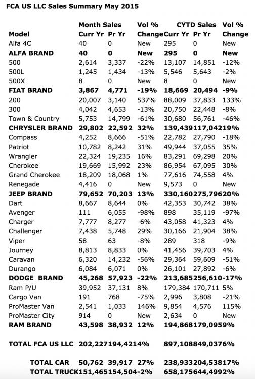FCA US LLC Reports May 2015 U.S. Sales Increased 4 Percent; Best May Sales Since 2005 62nd-consecutive month of year-over-year sales gains Sales exceed 200,000 units; first time since March 2007 Jeep® brand sales up 13 percent; best monthly sales ever Jeep Cherokee and Jeep Wrangler record their best monthly sales ever Chrysler 200 sales up 537 percent; best monthly sales ever Dodge Challenger sales increase 29 percent; best monthly sales ever Seven FCA US vehicles post sales records in May June 2, 2015 , Auburn Hills, Mich. - FCA US LLC today reported U.S. sales of 202,227 units, a 4 percent increase compared with sales in May 2014 (194,421 units), and the group’s best May sales since 2005. The Chrysler, Jeep ® and Ram Truck brands each posted year-over-year sales gains in May compared with the same month a year ago. The Chrysler brand’s 32 percent increase was the largest sales gain of any FCA US brand during the month. The group extended its streak of year-over-year sales gains to 62-consecutive months. “Our Jeep brand continues to set records with its best monthly sales ever in May, helping us to achieve our 62nd-consecutive month of year-over-year sales increases,” said Reid Bigland, Head of U.S. Sales. “Despite one less industry selling day this May versus a year ago, we posted a 4 percent sales gain and exceeded the 200,000-unit threshold for the first time since March 2007.” Seven FCA US vehicles set records in the month of May, including the Chrysler 200 which recorded its best monthly sales ever. Sales of the 200 were up 537 percent in May compared with the same month a year ago. The new 200 had the largest percentage increase of any FCA US vehicle in May. Likewise, the all-new Jeep Cherokee and Jeep Wrangler, and the Dodge Challenger each posted their best monthly sales ever. In addition, the Jeep Patriot, Ram ProMaster van, and Dodge Dart logged their best sales in the month of May. FCA US finished the month of May with a 69-day supply of inventory (540,509 units). U.S. industry sales figures for May are internally projected at an estimated 17.9 million units Seasonally Adjusted Annual Rate (SAAR). Chrysler Brand Chrysler brand sales were up 32 percent, the brand’s best May sales since 2008 and its 11th-consecutive month of year-over-year sales gains. Sales of the Chrysler 200 increased 537 percent in May, the mid-size sedan’s best monthly sales ever and the largest year-over-year percentage gain of any FCA US vehicle in the month. It was the ninth-consecutive month that the 200 logged record sales, topping its previous all-time monthly record in March of this year. Jeep® Brand Jeep brand sales increased 13 percent, the brand’s best monthly sales ever and its 20th-consecutive month of year-over-year sales gains. The Jeep brand has set a sales record in each month dating back to November 2013. Three Jeep brand vehicles set records in May. The Cherokee and Wrangler each recorded their best sales months ever, while the Patriot logged its best sales in the month of May. With its 16 percent increase, the Wrangler topped 20,000 units for the first time. The Patriot’s 31 percent year-over-year increase was the largest sales percentage gain of any Jeep brand model for the month. The all-new Jeep Renegade, the most capable small sport utility vehicle (SUV), had sales of 4,416 units in its second full month of sales, up 5 percent compared with sales in the previous month of April. The Renegade in May was selected by Kelley Blue Book’s KBB.com (www.kbb.com) for its annual list of the “10 Coolest New Cars Under $18,000.” The Jeep Grand Cherokee had its best May sales since the year 2000. Ram Truck Brand Ram Truck brand sales, which include the Ram pickup truck, Ram ProMaster, Ram ProMaster City, and Ram Cargo Van, were up 12 percent, the brand’s best May sales since 2005. Sales of the Ram pickup truck increased 8 percent in May, the pickup’s best May sales in 11 years. Sales of the Ram ProMaster van increased 146 percent, its best May sales since the full-size van was launched in October 2013. FIAT Brand Sales of the all-new 2016 Fiat 500X began in May as the first vehicles began to arrive in FIAT studios. The 500X combines iconic Italian style with functionality, performance and available all-wheel-drive confidence. The vehicle is available in five trim levels. The base Manufacturer’s Suggested Retail Price (MSRP) for the 2016 Fiat 500X starts at $20,000 (excluding a destination charge of $900). FIAT brand sales, which include the Fiat 500 and 500L, were down 19 percent in May, compared with the same month a year ago. The 500 was selected in May by Kelley Blue Book’s KBB.com as one of its “10 Coolest New Cars Under $18,000.” Dodge Brand Sales of the Challenger increased 29 percent in May, the muscle car’s best monthly sales ever. Dart sales were up slightly year-over-year as the compact sedan posted its best ever sales in the month of May. Dodge Durango sales edged up slightly for its best May sales since 2005. Dodge brand sales were down 22 percent in May, compared with the same month a year ago, due in large part to model changeover at the Windsor Assembly Plant in Windsor, Ontario, where the Dodge Grand Caravan and Chrysler Town & Country are built. The plant resumed production of Grand Caravans in late May.