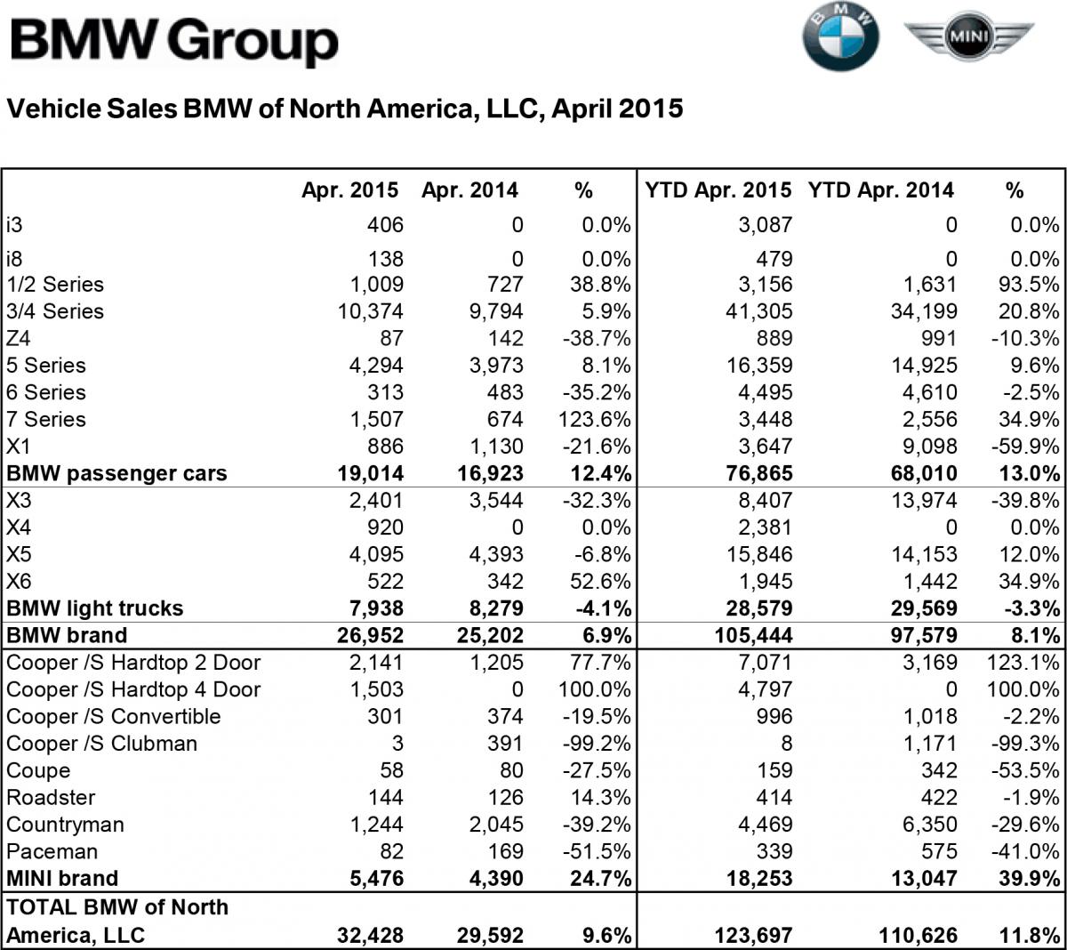19. BMW Group U.S. Reports April 2015 Sales BMW brand up 6.9 percent, sets April record MINI brand sales up 24.7 percent Woodcliff Lake, NJ – May 1, 2015… Sales of BMW brand vehicles increased 6.9 percent in April for a total of 26,952 compared to 25,202 vehicles sold in April, 2014. “A good April result with a BMW sales record is the perfect set-up going into what are typically the even stronger sales months of May and June,” said Ludwig Willisch, President and CEO, BMW of North America. “All of us at BMW are excited about this season because starting right now, in May, we are celebrating 40 years of an icon, the BMW 3 Series, the most successful BMW of all-time and the world standard in its segment.” In April, notable vehicle sales included the BMW 3 / 4 Series which increased 5.9 percent to 10,374 vehicles and the BMW 2 Series which increased 38.8 percent to 1,009 vehicles. The BMW X5 has increased 12.0 percent year-to-date with 15,846 sold compared to the first four months of 2014. BMW Group Sales In total, the BMW Group in the U.S. (BMW and MINI combined) reported April sales of 32,428 vehicles, an increase of 9.6 percent from the 29,592 vehicles sold in the same month a year ago. MINI Brand Sales For April, MINI USA reports 5,476 automobiles sold, an increase of 24.7 percent from the 4,390 sold in the same month a year ago.