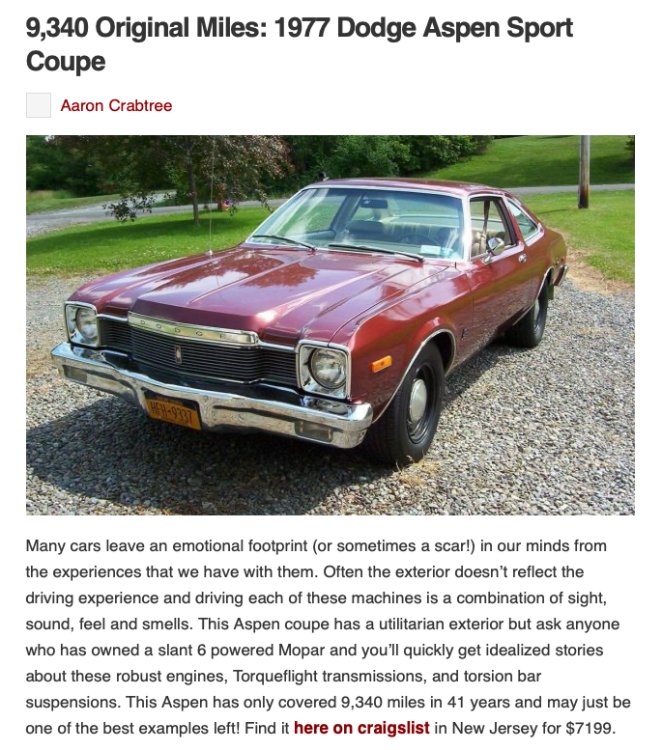 ^ I've noted ads about low-mileage 20-30 yr old cars popping up, unremarkable other than being in great condition, but kinda being pitched as a collector car. 'Would you put this 35K mile Chevy Celebrity in your driveway for $5000?', but I say - buy it as a commuter vehicle, not a collectible, and use it up. It sure beats spending $15K for something 7 yrs old.- Random Thoughts Thread