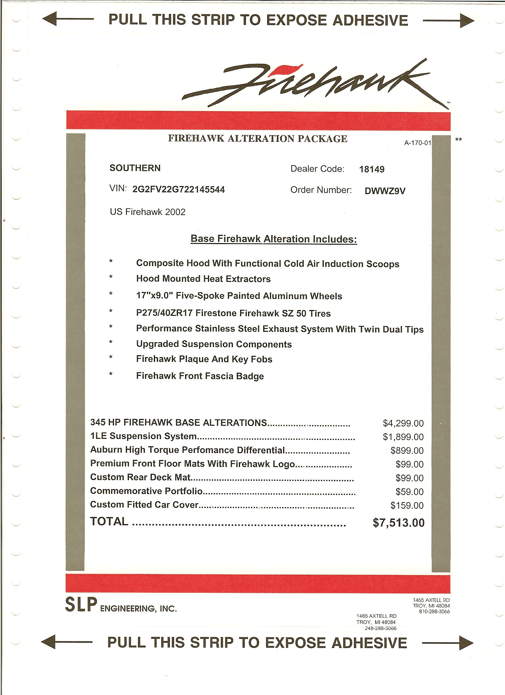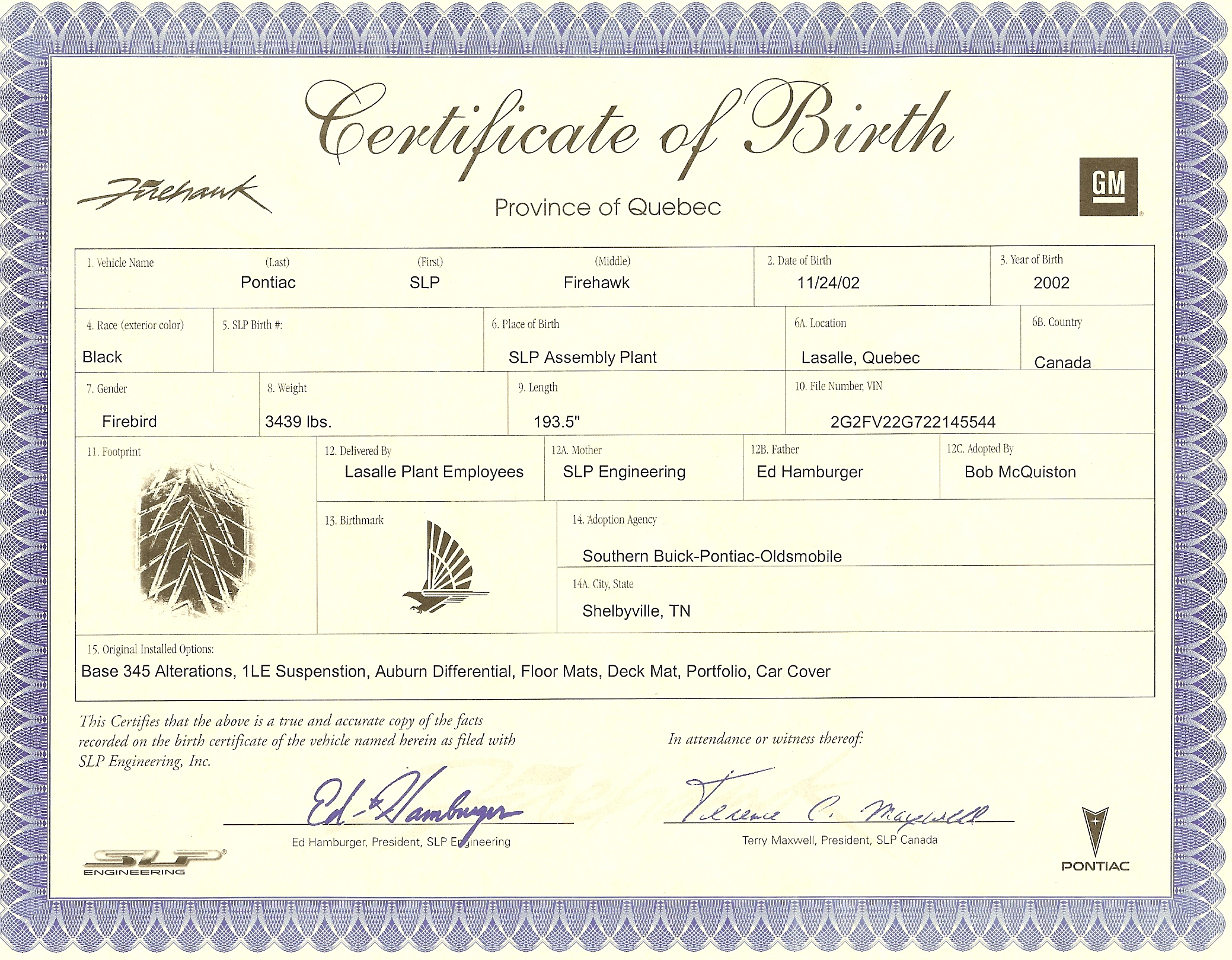 Alot of the stuff on the Birth certificate isn't really accurate. My car was actually built in Troy,MI by SLP Engineering techs. But, the important stuff(options, date built, etc.) is right. They finished my car on 11/24/02, signed and shipped it on 11/25/02, and I had it on 11/26/02. I wish they could have custom-made one of these for me to show all of the info. but you can't have everything.