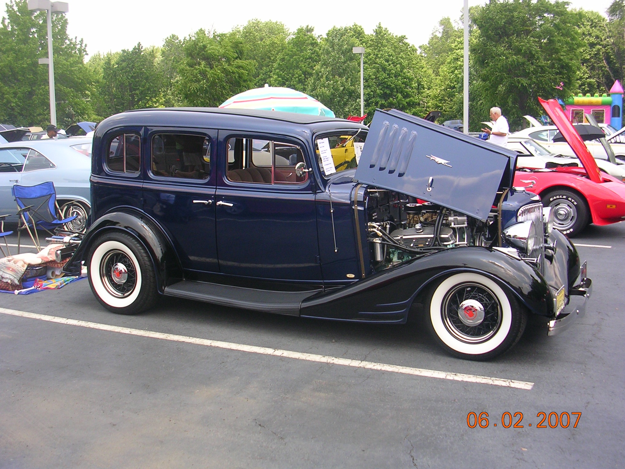 I don't think it had a Dodge Bros. grille emblem on it... on each side of the hoods is an early '60s Tri=Power emblem... this 1933 Pontiac has a '66 GTO 389 V8 stuffed in there... the color is Indigo Blue (GMC Sonoma color from '99, the owner said) over black fenders.- It's Pontiac Custom-S's BIRTHDAY!